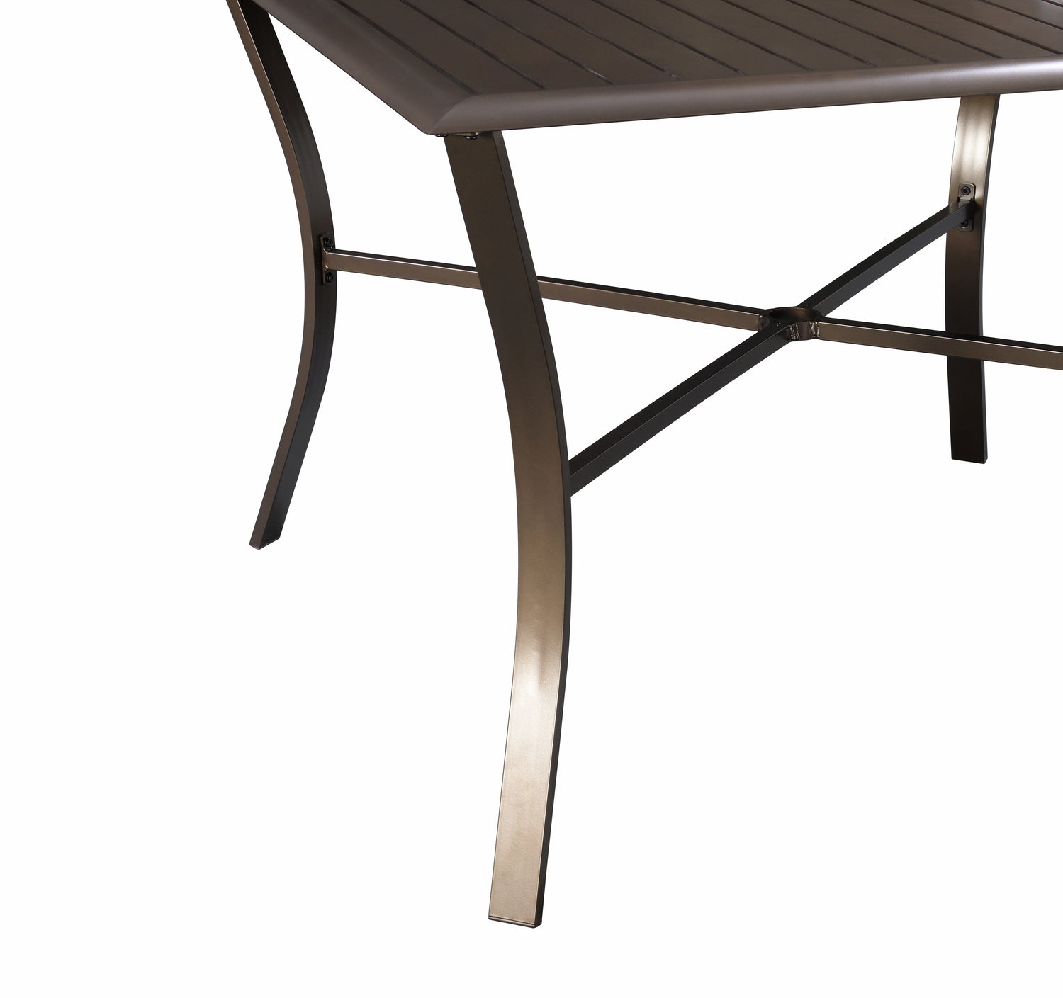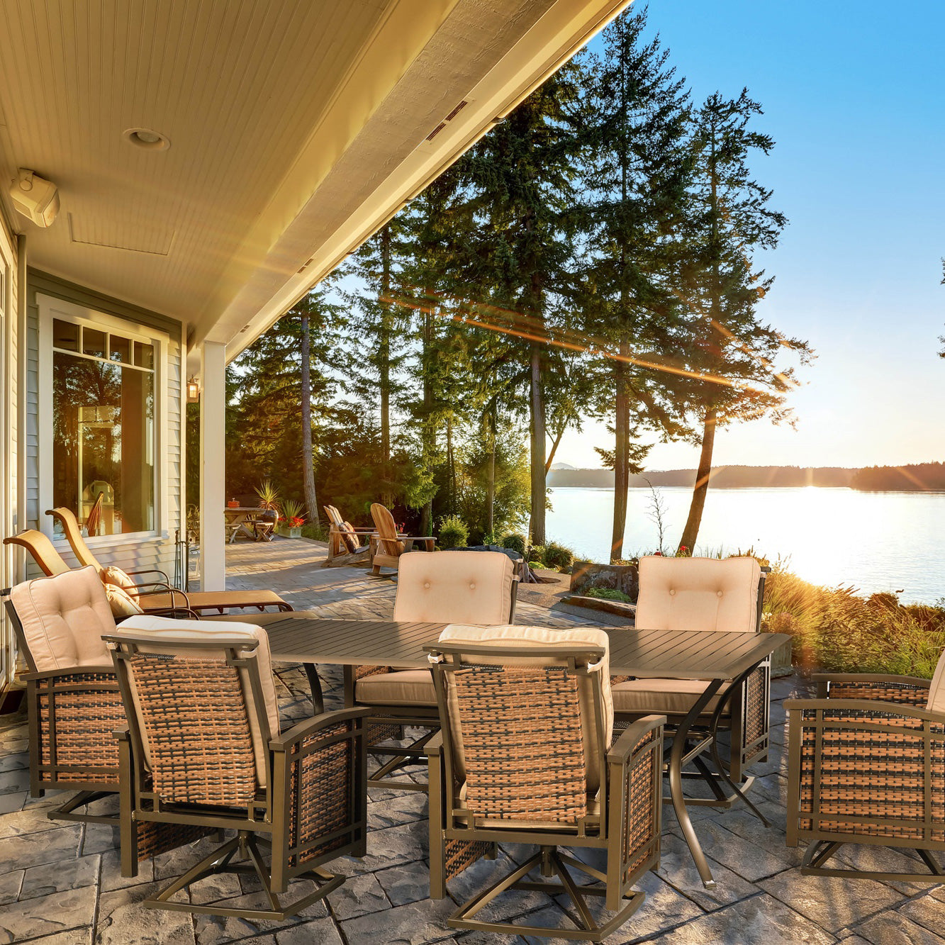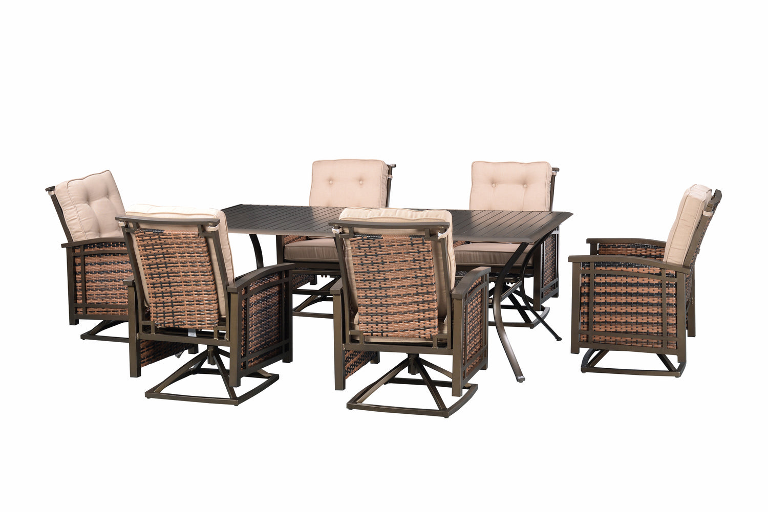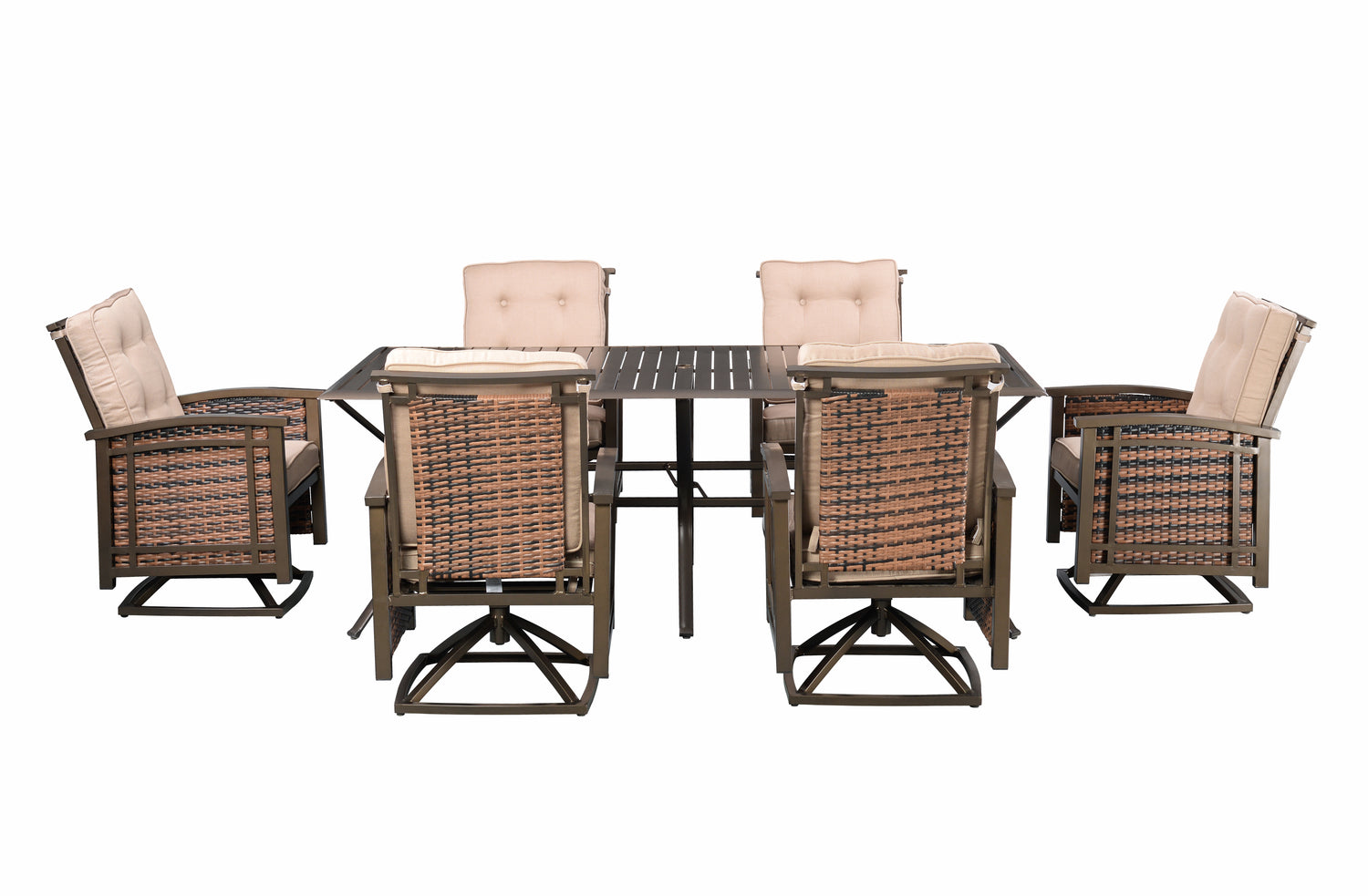 The Palmetto 7-piece Dining Set includes a slat-top, rectangular table and six chairs. The Palmetto Set is constructed fully in cast aluminum, a material known for being rust-proof, lightweight, sturdy, low maintenance, and weather resistant. The table has a unique slat top, which is a great alternative to glass, and includes a 2-inch wide umbrella hole. The table is 42" wide by 82" long with 28" of clearance underneath the table, making it an excellent choice for al fresco family meals. The chair's resin wicker accents are handwoven. The 4" thick all-weather, tan-colored cushions are constructed of Olefin, a soft, durable material. It's resistant to mold and UV fading, and holds up well in the outdoors. Chairs both swivel and rock for a very comfortable and relaxing outdoor living experience.