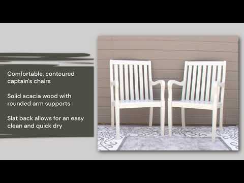 Add a piece of farmhouse charm to both your indoor or outdoor living space with the Bridgeport 5pc Rectangle Dining set by Pebble Lane Living. Made from sustainable acacia wood, this beautiful set can be used inside for nightly family dinners, or outside for fun al fresco dining. The wood is painted in a whitewashed, creamy light gray finish that’s UV stable to hold up to outdoor elements and daily wiping after use. The set features a beautiful trestle base table and comfortable contoured captain’s chairs. Enjoy mealtimes for years to come with this classic Bridgeport set!