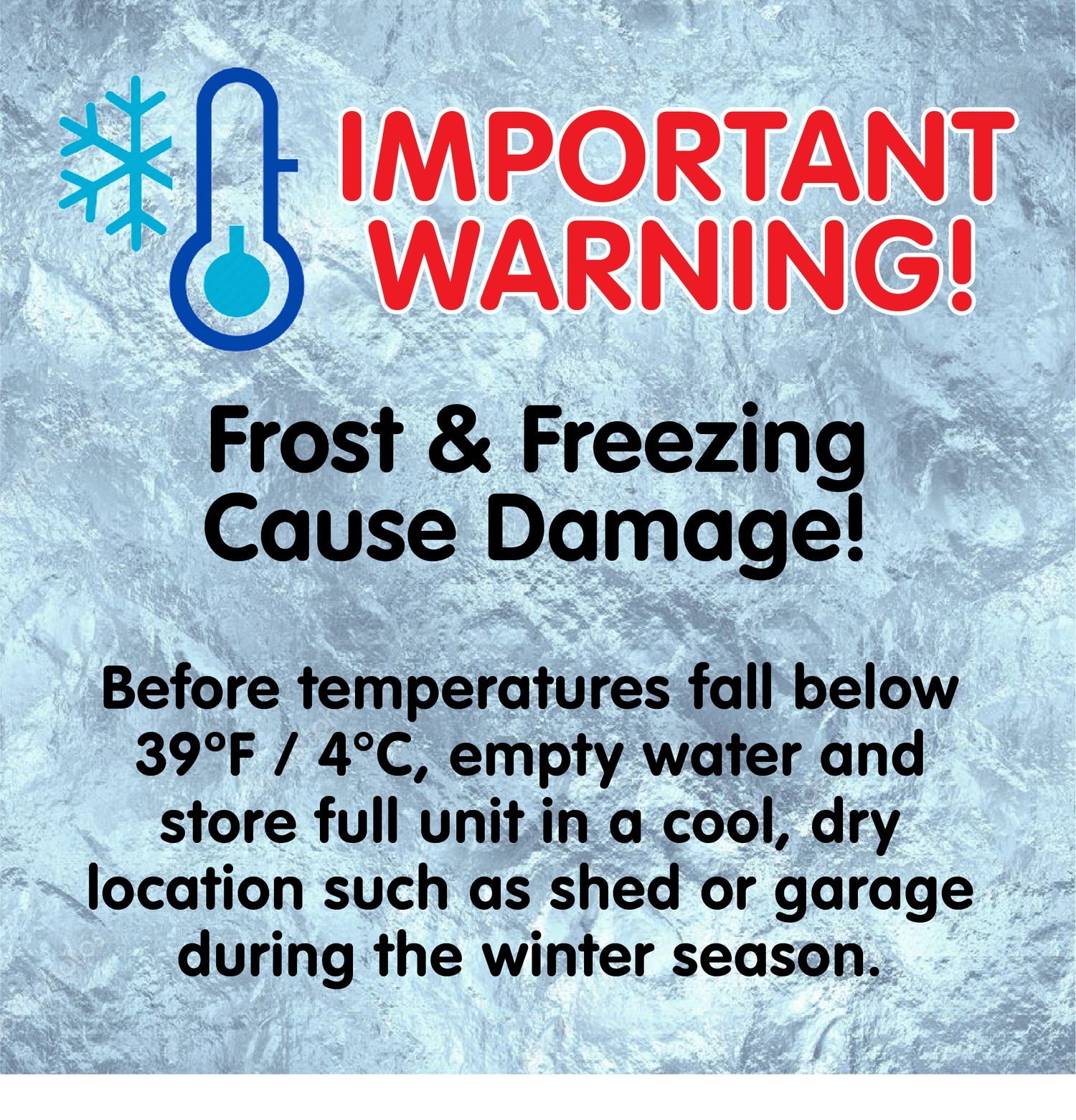• Note: Freezing causes damage. Do not leave outside in winter. Empty water and store whole unit indoors (shed/garage) before temps at night get low enough for frost.