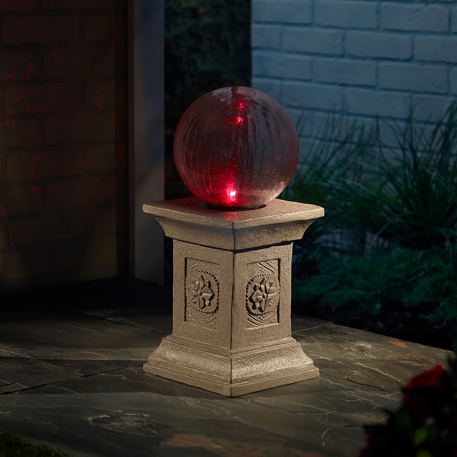 The Smart Solar Gazing Ball with Tuscan Pedestal is a gorgeous accent ideal for decorating patios, walkways, garden and outdoor areas. The 8” LED gazing ball is powered by an integrated solar panel eliminating the need for any external wires and automatically illuminates in the darkness when charged. On a full charge, the ball will illuminate up to 10 hours. The gazing ball features 2 modes: white or cycle through colors. The Tuscan pedestal features an intricate fleur detail on each side of the column and is constructed of glass fiber reinforced concrete (GFRC) for optimal weight and durability.