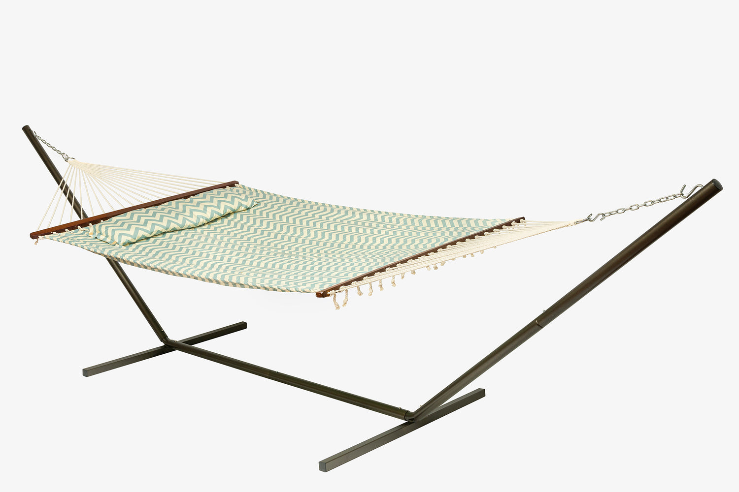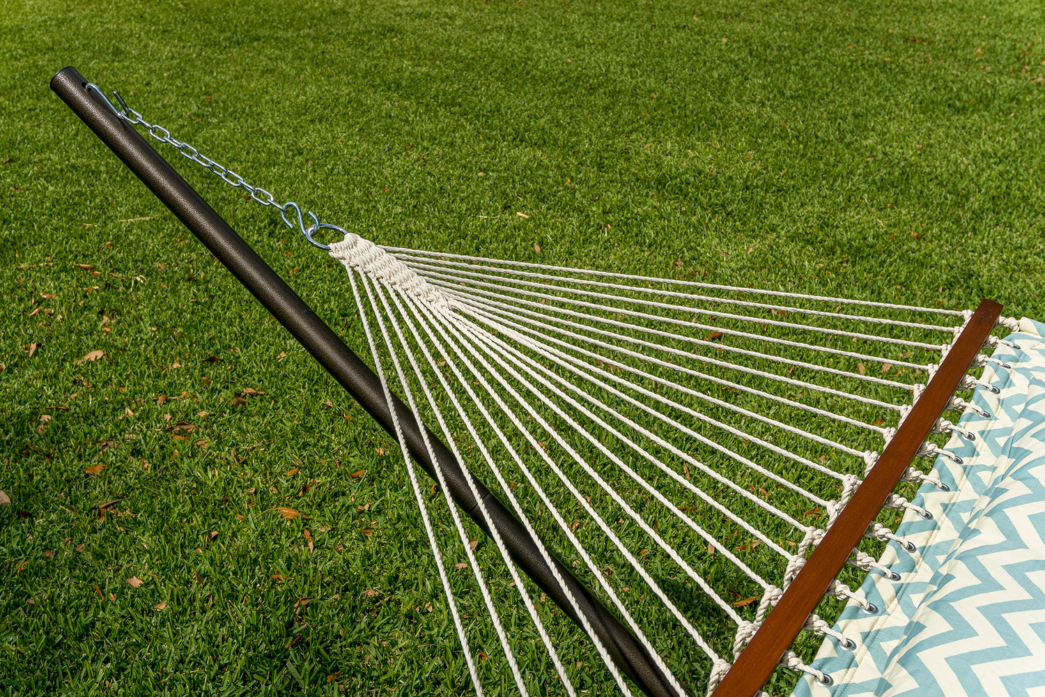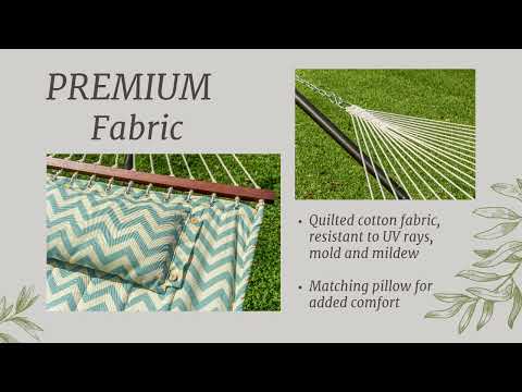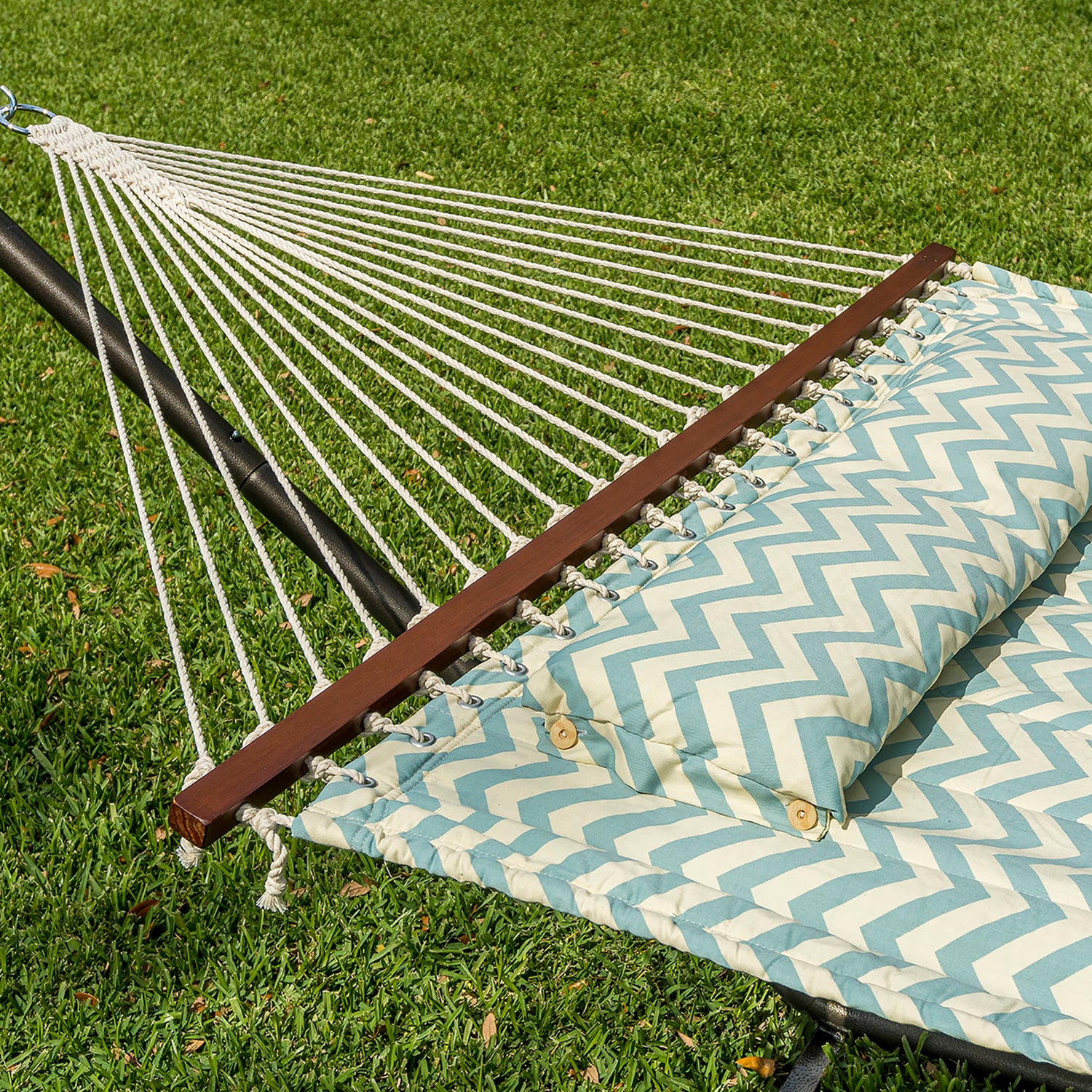 Spruce up your backyard with the Coronado Double Quilted Hammock - Blue Chevron. The quilted cotton fabric is plush, weather-resistant, durable, AND comfortable. For additional comfort, a matching button-on pillow is also included. Zinc plated hanging rings and hardware are included to make set up a breeze!