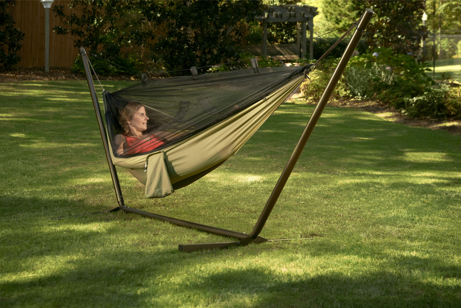 Rest well in the great outdoors with Smart Living's Camping Hammock with Mosquito Netting. This hammock is constructed of quick dry nylon and includes a bag for optimal portability to your favorite parks and spaces. Hammock is designed for individual use and creates a comfortable cocoon, perfect for those long summer afternoon naps after a big hike (or good book!). Olive/khaki shade reflects outdoor enthusiasm and nature. Can be used with our Premium Hammock Tree Straps or Belize Hammock Stand. Maximum weight capacity is 300 pounds.