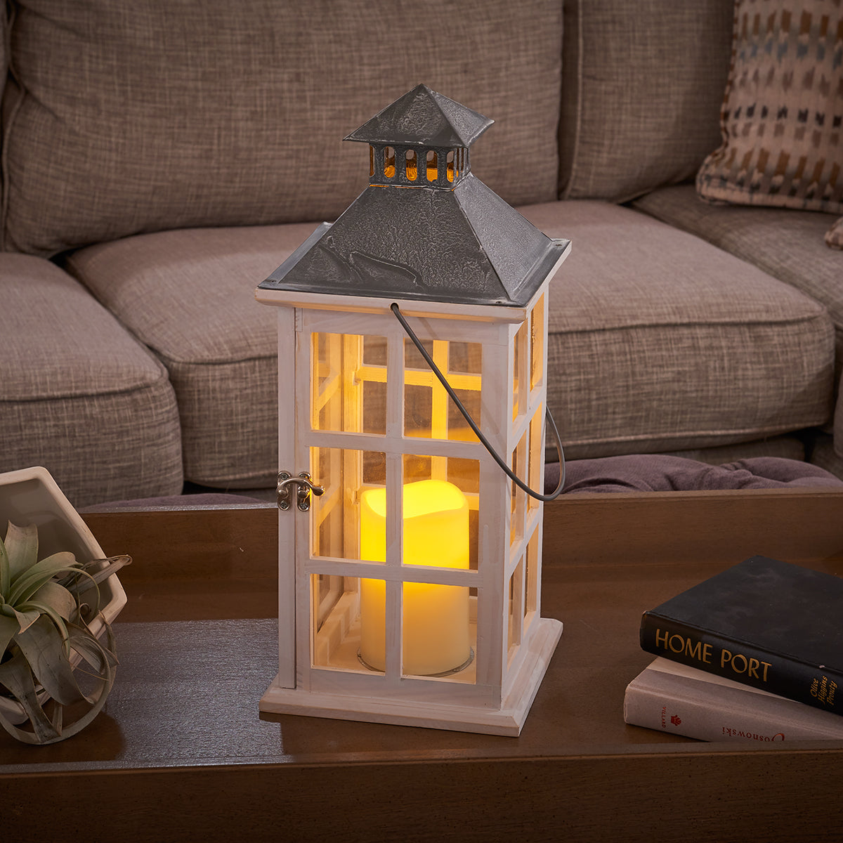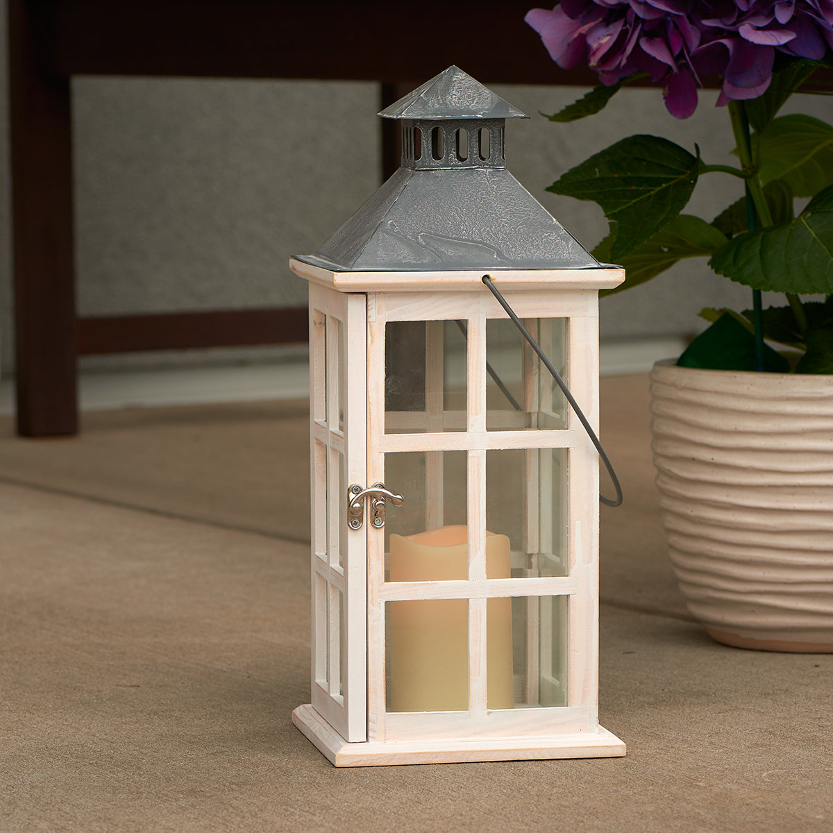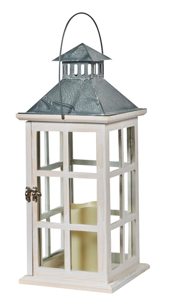 The Camden Candle Lantern is a light, refreshing white lantern that adds charm, elegance and warm light to your home. Standing 16 inches tall, the Camden Candle Lantern features real wood with a weathered tin top, real glass panes and is illuminated with one amber LED candle. Lantern features an on/off switch with a six hour timer. Simply activate timer mode at the desired time and the lantern will stay on for six hours, turn off for 18, and then illuminate again at the same time every day. The lantern has a metal handle for hanging or makes a great table top piece. Easy to use indoors or outside. Requires 2xAA batteries (not included)