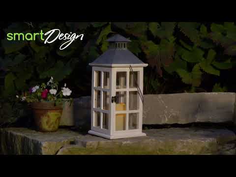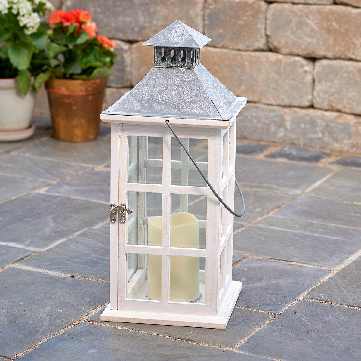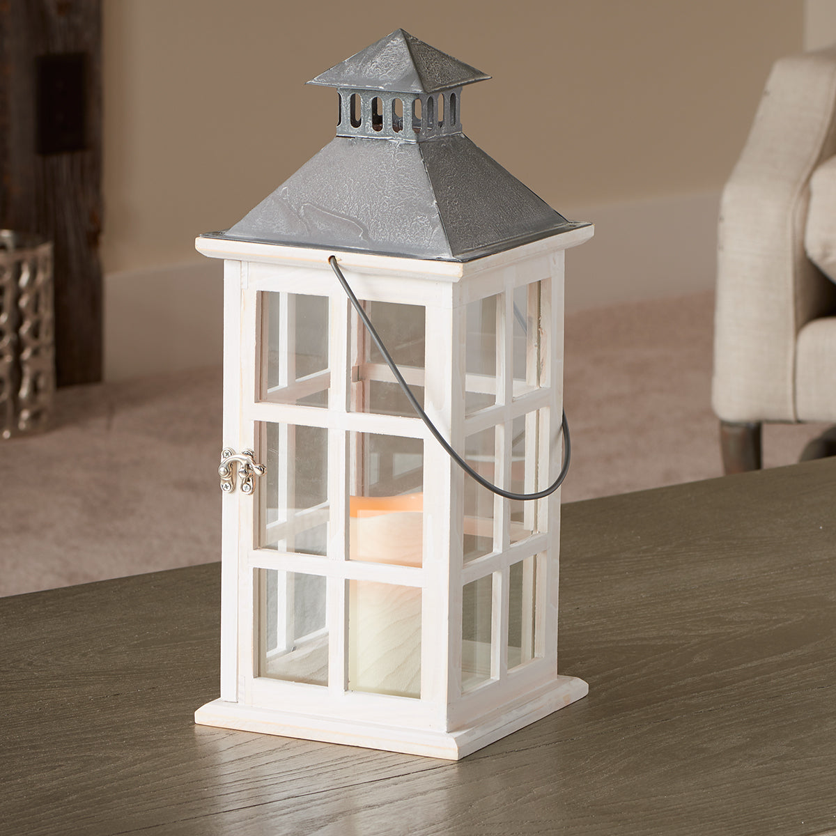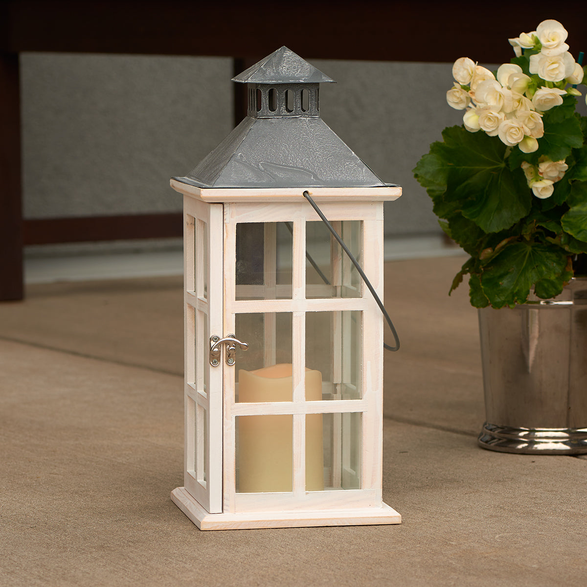 The Camden Candle Lantern is a light, refreshing white lantern that adds charm, elegance and warm light to your home. Standing 16 inches tall, the Camden Candle Lantern features real wood with a weathered tin top, real glass panes and is illuminated with one amber LED candle. Lantern features an on/off switch with a six hour timer. Simply activate timer mode at the desired time and the lantern will stay on for six hours, turn off for 18, and then illuminate again at the same time every day. The lantern has a metal handle for hanging or makes a great table top piece. Easy to use indoors or outside. Requires 2xAA batteries (not included)