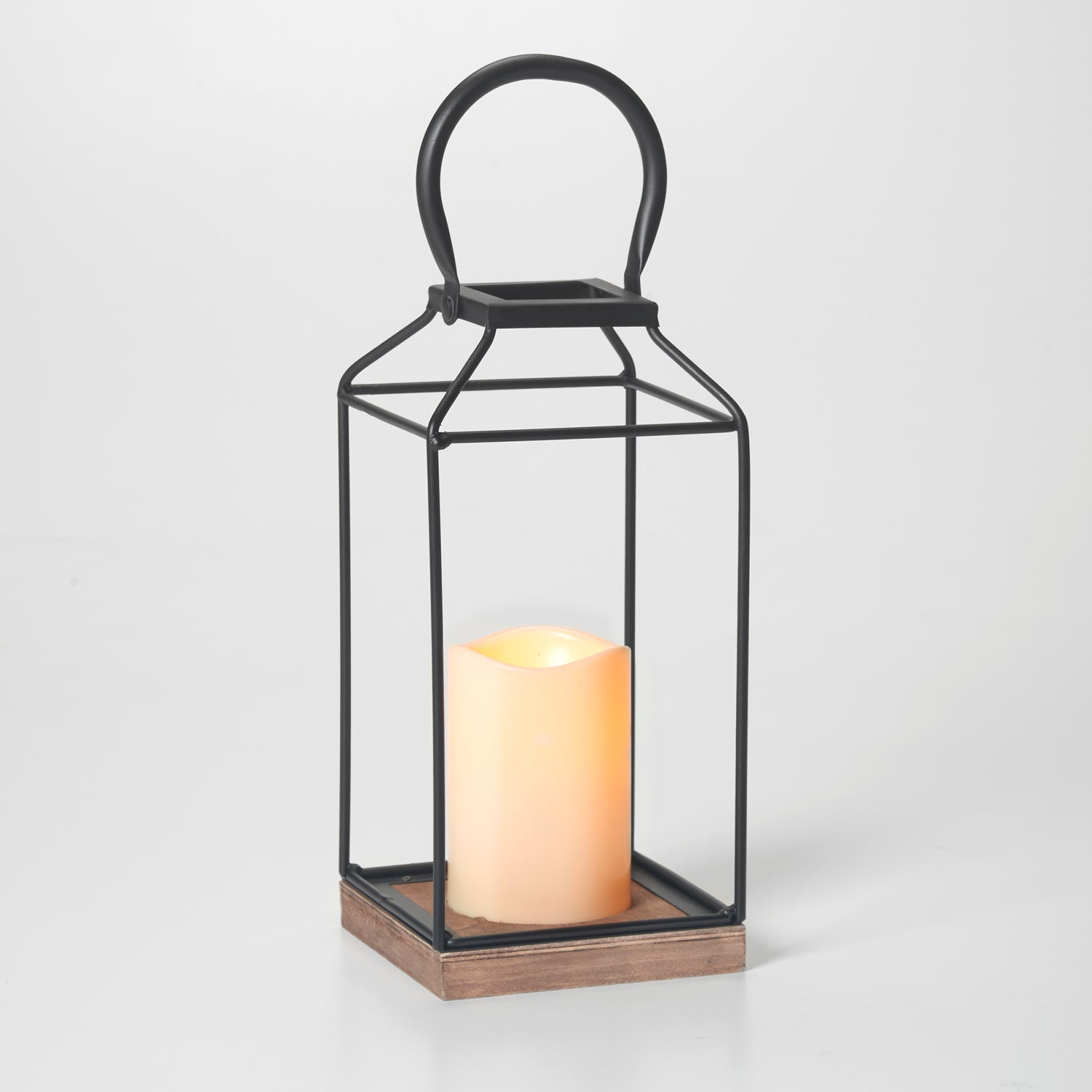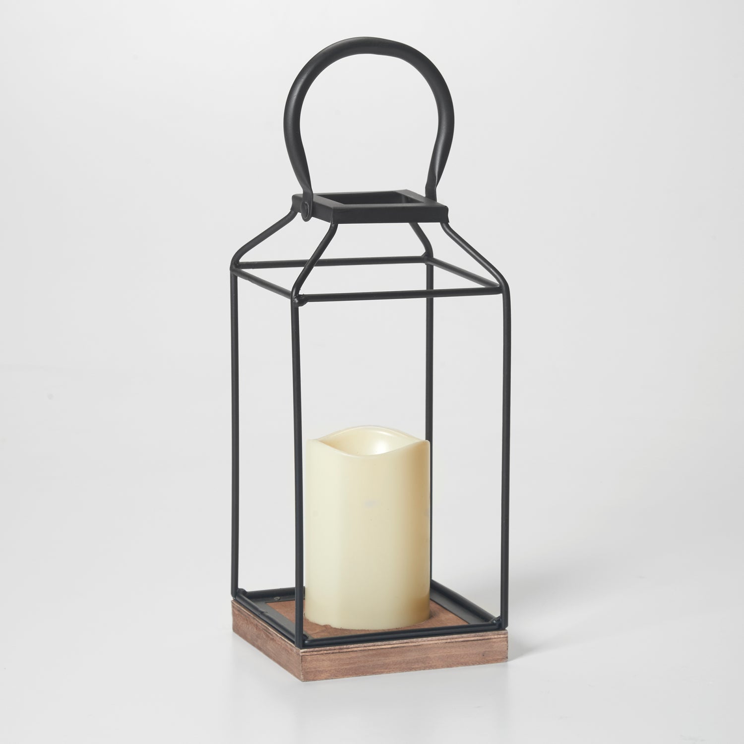 - Matte black open frame metal lantern with real wood base