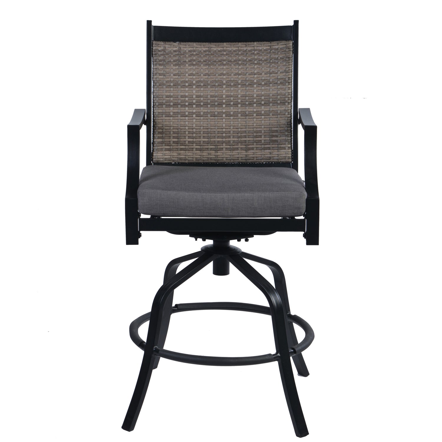 Swivel, sip and lounge comfortably with your family and friends in the Wicker Swivel Bar Chair Set by Pebble Lane Living. This all-weather set includes two chairs, and is constructed in cast aluminum and wicker with a black powder coated finish. Cast aluminum is a rust-proof, lightweight, sturdy, low maintenance, and weather resistant material. Chairs have arm rests and foot rests. Olifen gray padded cushions with Velcro ties are included for additional comfort.