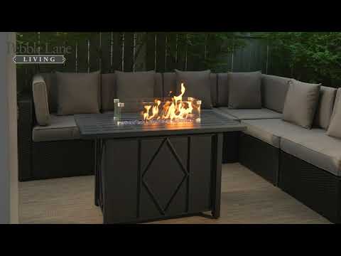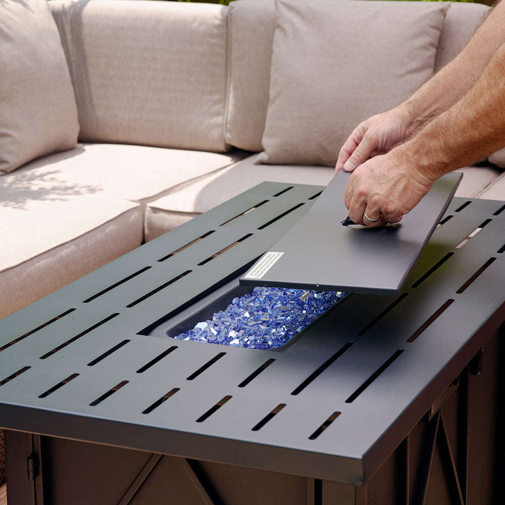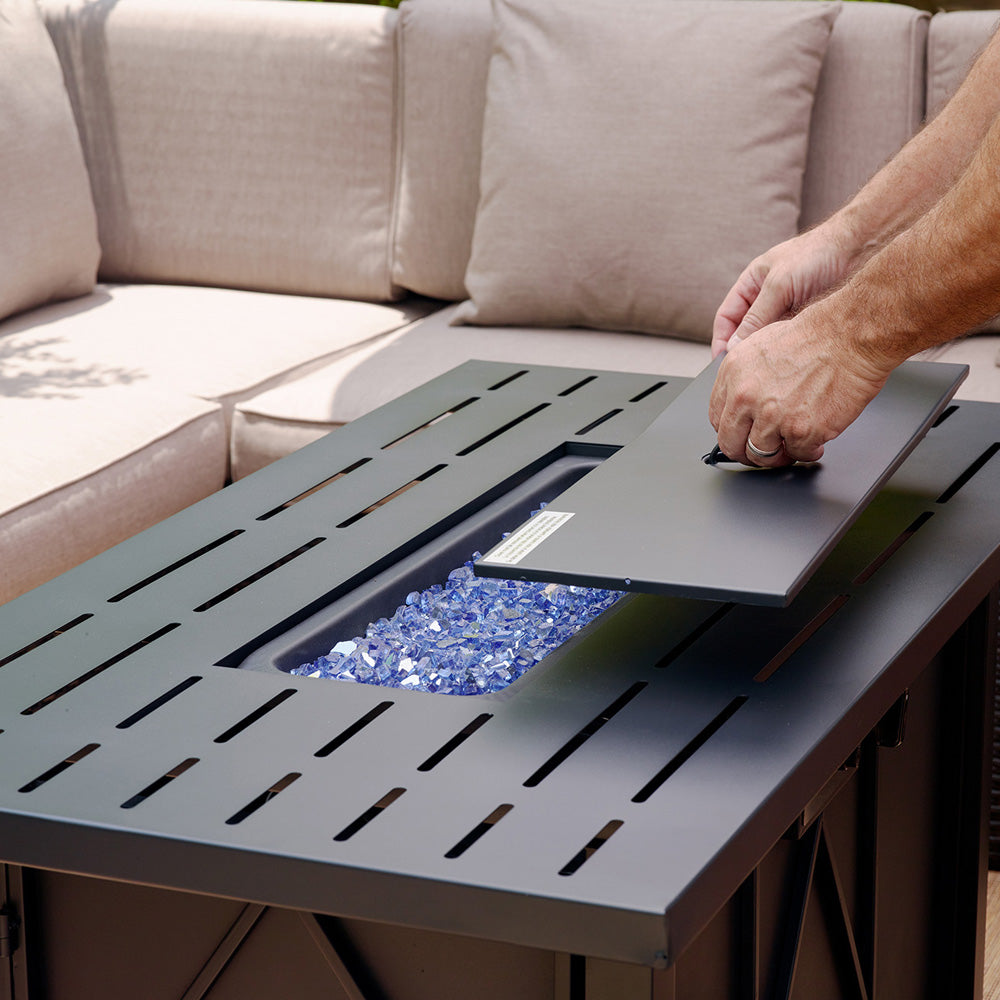 Enjoy cozy times in your outdoor living space with this all-weather steel slat top style fire pit. This clean burning propane model eliminates the smell and mess of traditional wood burning fire pits. The powder-coated matte black finish will compliment any outdoor furniture and décor. Blue fire glass picks up the fire's glow. The flame is easy to ignite and control with the simple to use control panel. A PVC-lined cover is included for when the fire pit is not in use. The edge around the burner is perfect for casual drinks and snacks. Start making warm memories with family and friends around the fire pit today!